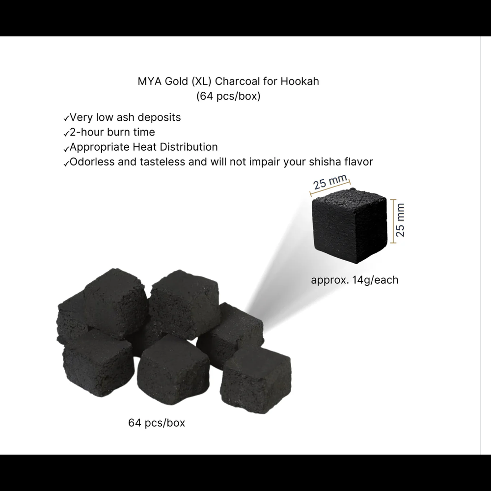Bring power and purity to your hookah sessions with MYA Gold XL Hookah Charcoals (64 pcs). These premium coals are specially formulated to deliver extended heat, minimal ash, and a clean burn—perfect for enthusiasts who demand performance without compromise.