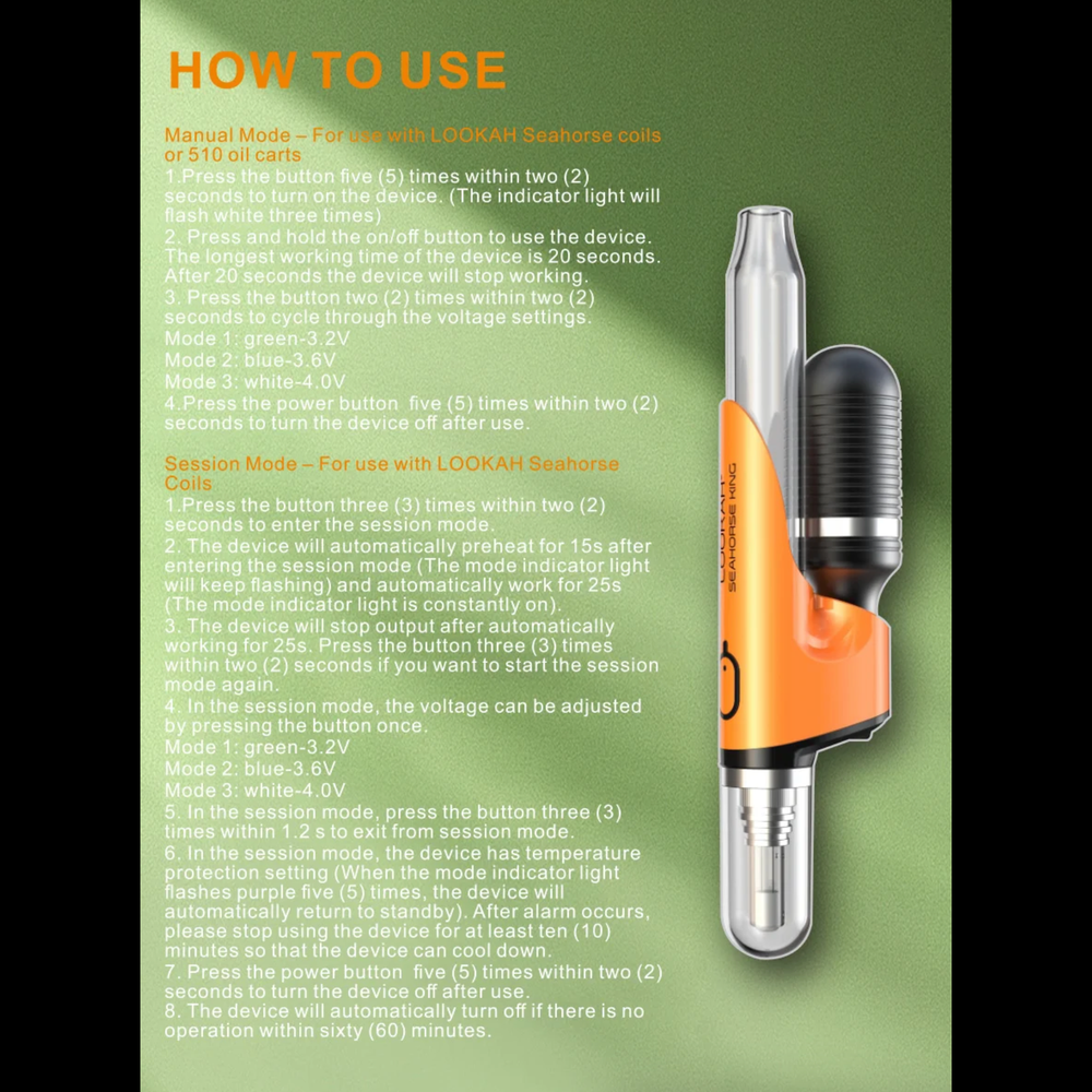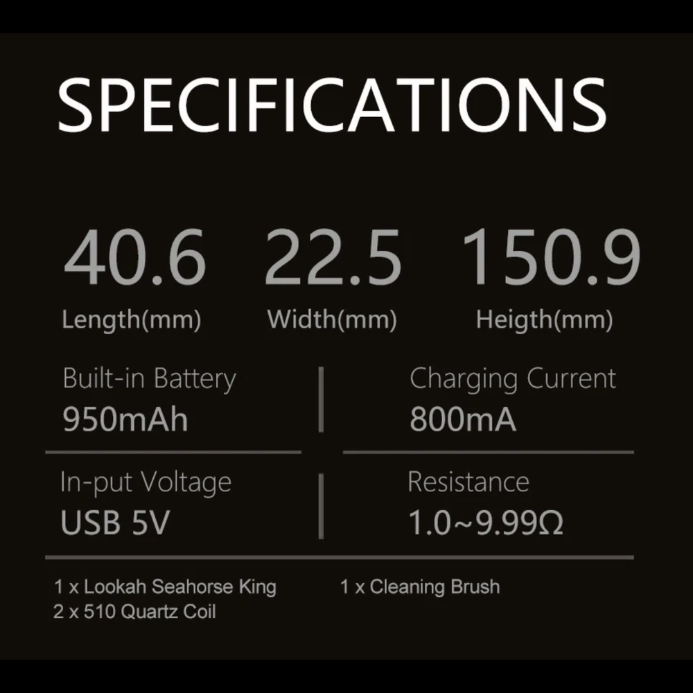 The Lookah Seahorse King is a high-performance electric nectar collector crafted for wax and concentrate enthusiasts who value convenience, flavor purity, and modern design. Its rugged metal construction, transparent vapor path, and powerful battery make it an eye-catching and reliable tool—perfect for both travel and home use.