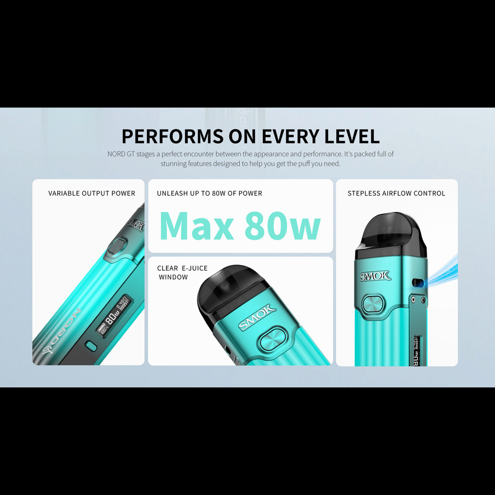 The SMOK Nord GT Kit is a versatile and powerful pod system designed for both MTL (Mouth-To-Lung) and DTL (Direct-To-Lung) vaping styles. With its robust features and sleek design, it's suitable for both beginners and experienced vapers seeking a customizable and satisfying vaping experience.