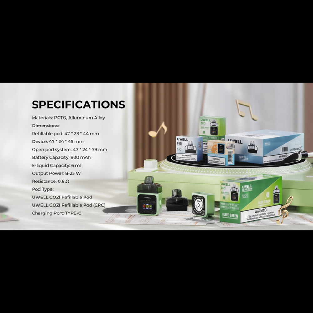 Compatible with Uwell Cozi pods, pre-installed with a 1.0 Ω coil for smooth mouth-to-lung (MTL) draws.