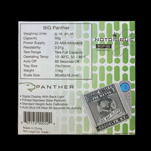 The Notorious B.I.G Panther Digital Pocket Scale by Infyniti Scales is a tribute to one of hip-hop's most iconic figures, combining precision weighing with a design that honors Biggie Smalls. Whether you're a collector, a fan, or someone in need of a reliable scale, this limited-edition model offers both functionality and style.