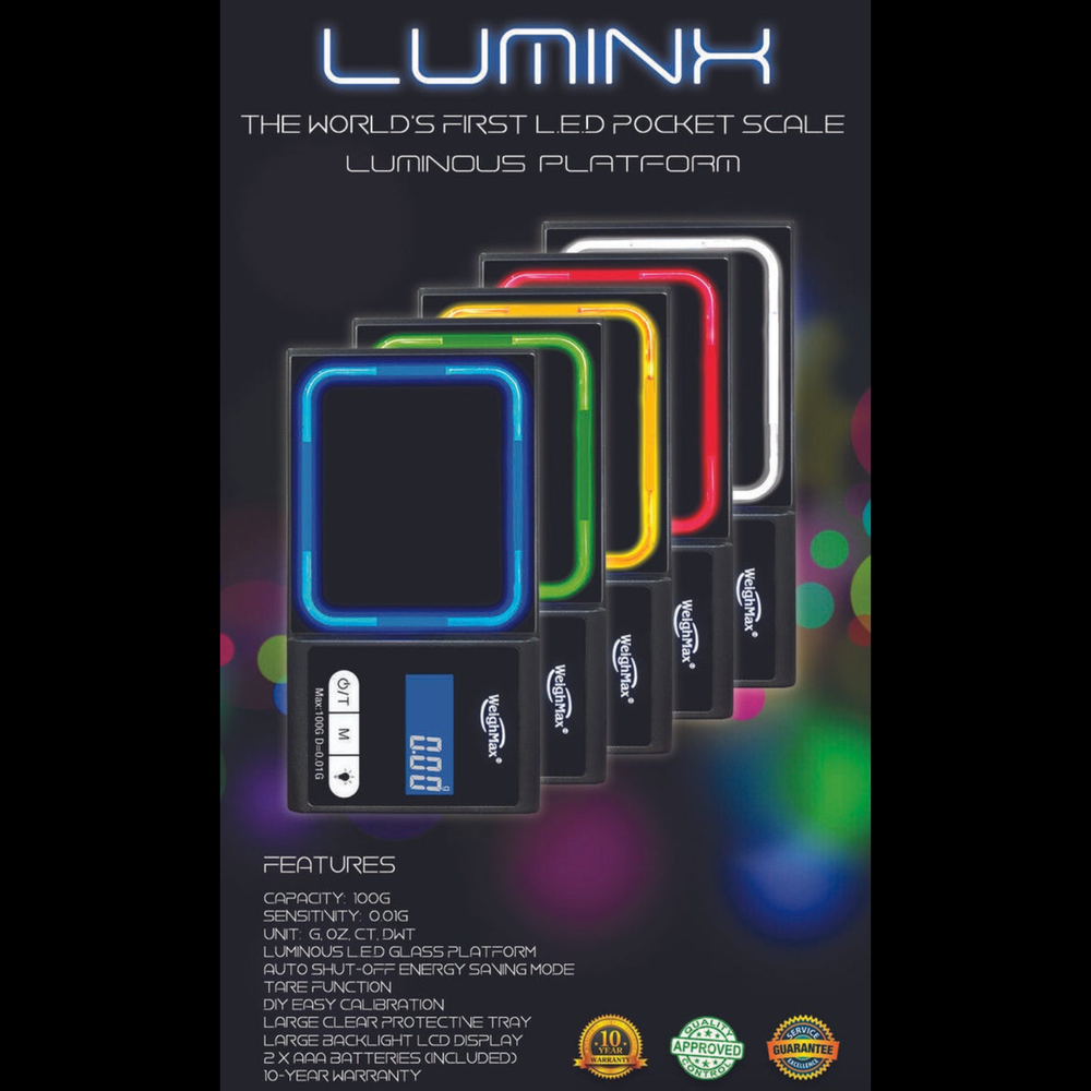 The WeighMax Luminx LED Pocket Scale combines accuracy with flair, featuring a luminous LED-lit glass platform and vibrant backlit display. Designed for portability and precision, this pocket scale is perfect for jewelry, herbs, culinary needs, and hobby measurements. With dual capacity options, it’s built to deliver reliable results in style.